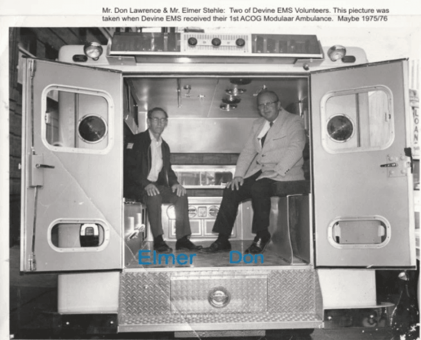 In 1974, under the leadership of Mayor Harvey Squire, the City of Devine acquired State of Texas License to Operate an EMS service. The city at that time asked for Volunteer's to run the service. Mr. Don Lawrence was hired by the City of Devine as Manager of the newly formed Devine EMS. This service was operated by the volunteers from 1974 to 2005. The volunteers of Devine EMS provided excellent services to the district's citizens, 24 hours a day 365 days a year for 30 years. We honor their service and dedication to the citizens of our District and will forever be remembered by many.